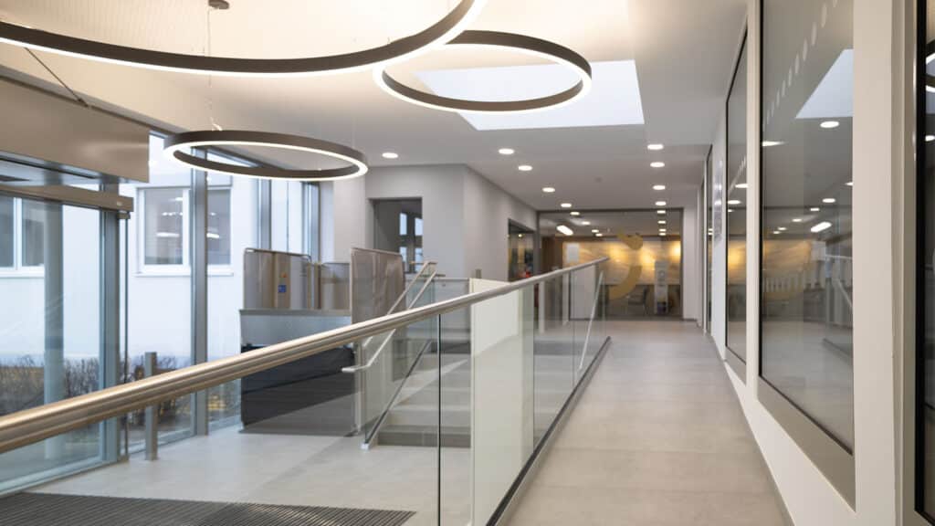Transformation des Eingangsbereiches der Main-Klinik in Ochsenfurt. Helle Fliesen, Glasgeländer, Ringleuchten mit warmem Licht – so werden die Patienten und ...