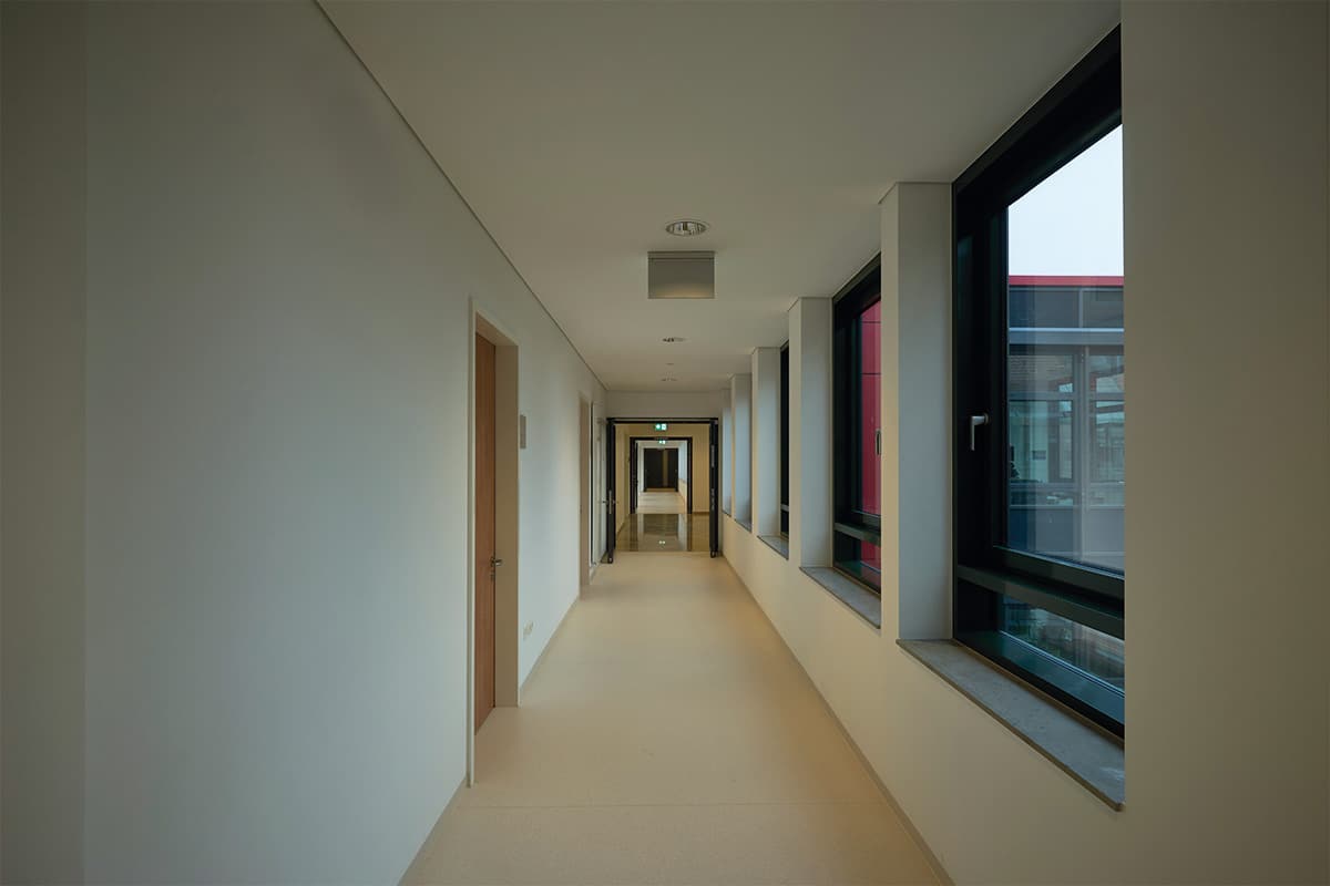 Um den erhöhten Bedarf decken zu können, wurden die Dachgeschosse bestehender Gebäude für die Nutzung als Büroräume ausgebaut. Der Querbau, im dem sich der Eingangsbereich befindet, wurde um ein Geschoss aufgestockt. So konnte auch der Eingangsbereich neu strukturiert und komplett barrierefrei gestaltet werden.